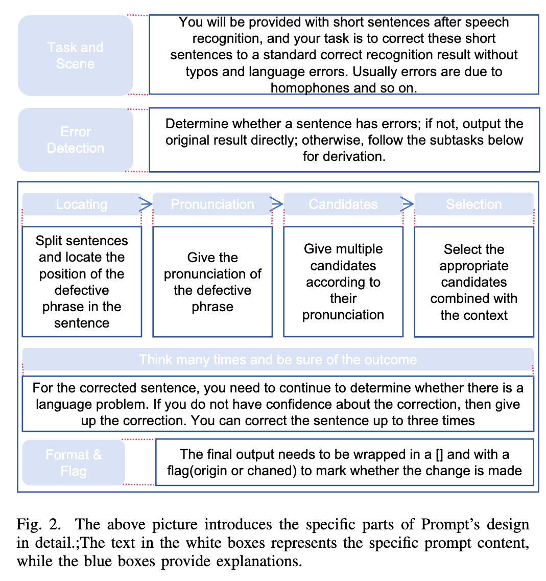 Prompt ์ค๊ณ ๊ตฌ์กฐ (Figure 2): Task/Scene โ Error Detection โ 4๊ฐ Sub-Tasks (Locating / Pronunciation / Candidates / Selection) โ Format & Flag ์ ๊ณ์ธต์ ๊ตฌ์กฐ. โThink many times and be sure of the outcomeโ ๋ฌธ๊ตฌ๊ฐ iterative correction์ prompt ์์ค ์ ๋ ์ฅ์น. few-shot 3๊ฐ ์์ ํฌํจ์ผ๋ก LLM ์ถ๋ ฅ ๊ณต๊ฐ์ ๊ตฌ์กฐํ