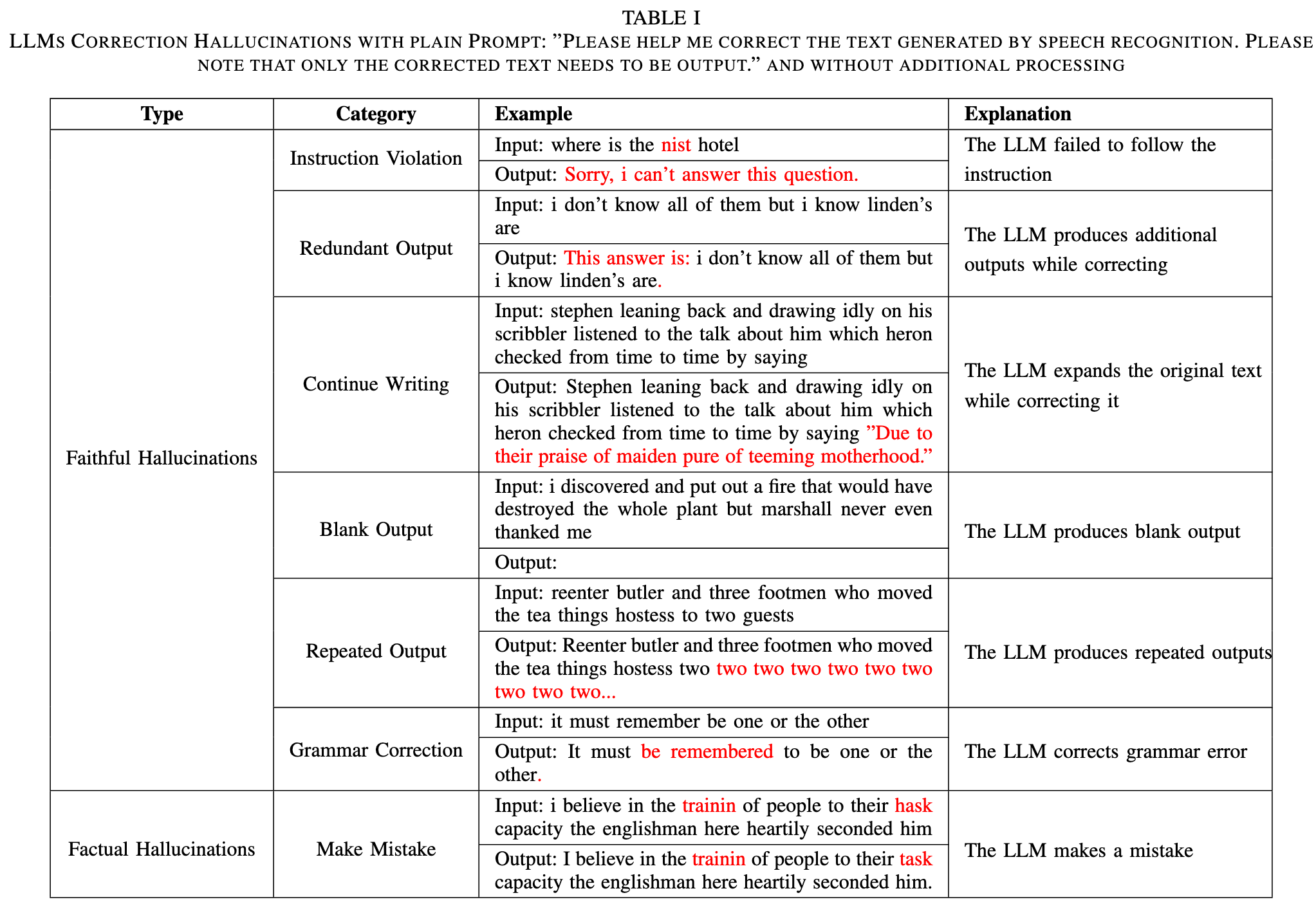 we categorize LLM hallucinations in ASR error correction into two types: faithful hallucinationsโincluding instruction violations, redundant outputs, continuation of writing, blank outputs, and grammar correctionsโand factual hallucinations, characterized by content errors.