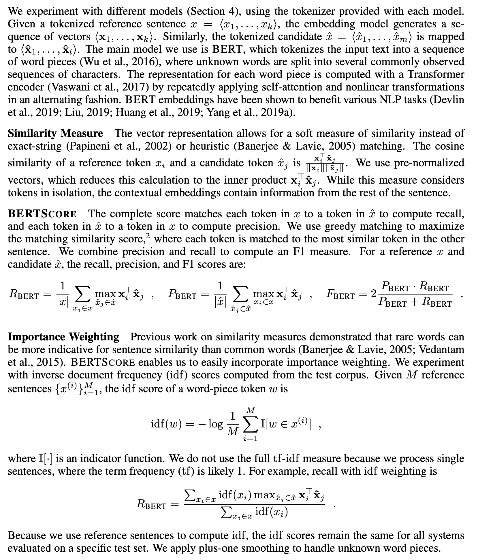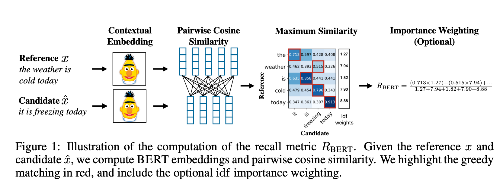 Zhang, T., Kishore, V., Wu, F., Weinberger, K. Q., & Artzi, Y. (2020). BERTScore: Evaluating Text Generation with BERT (arXiv:1904.09675). arXiv. https://doi.org/10.48550/arXiv.1904.09675