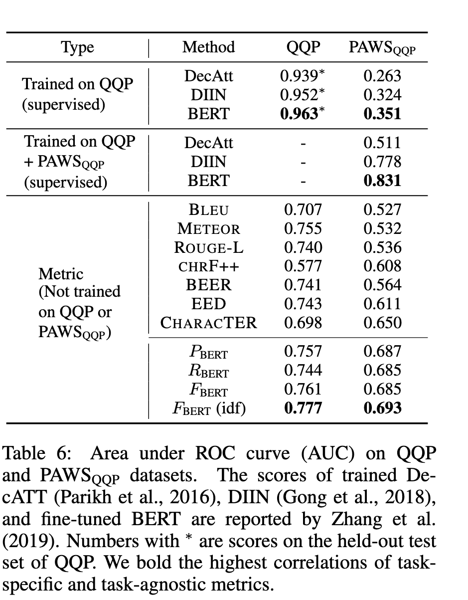 Results:: PAWS ์ ๋์ ์์ ์์ ๋ค๋ฅธ ๋ฉํธ๋ฆญ์ chance ์์ค ํ๋ฝ, BERTScore๋ ์ํญ ํ๋ฝ๋ง. ์ค๊ฐ ๋ ์ด์ด๊ฐ ์ต์ (Appendix B). WMD optimal matching ๊ต์ฒด ์ ์ผ๊ด๋ ๊ฐ์ ์์(Appendix C)