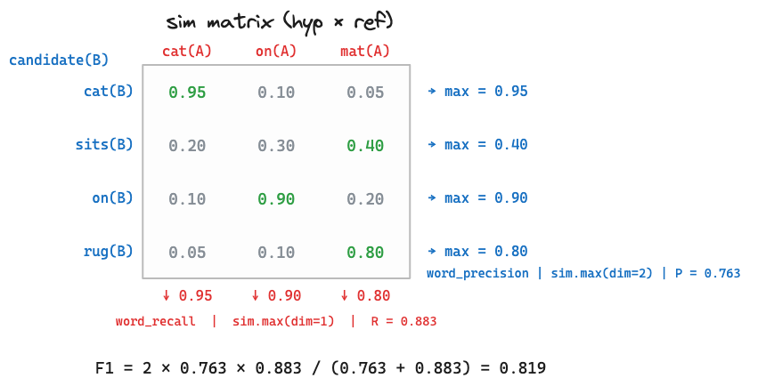 | Recall | ref ๊ฐ ํ ํฐ์ hyp ์ต๋ ๋งค์นญ | sim.max(dim=1) |