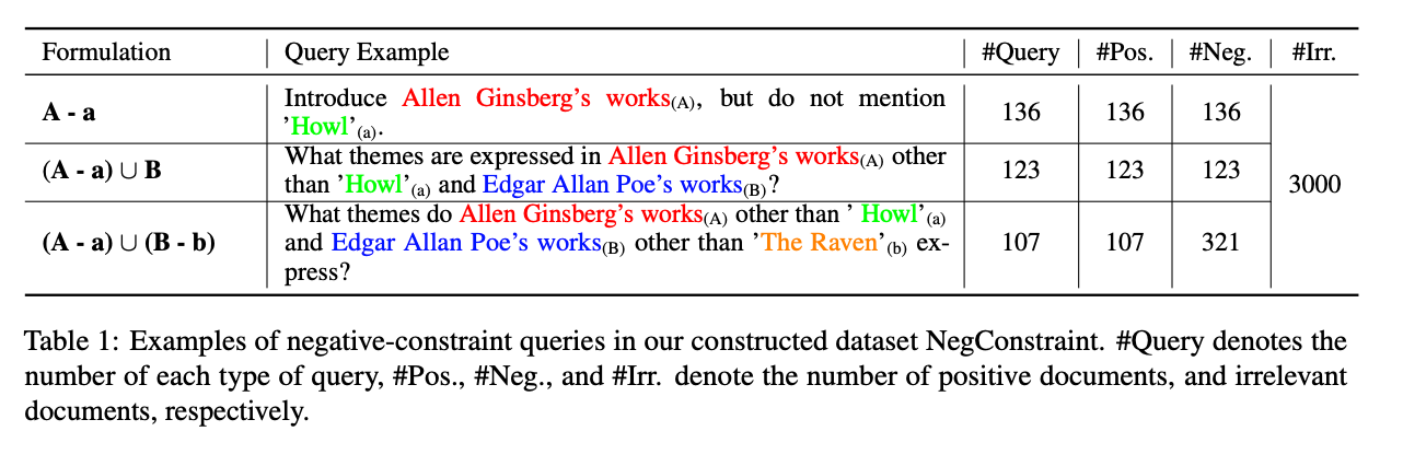 - ๋ถ์ ์ ์ฝ ์กฐ๊ฑด(Negative Constraints)์ด ํฌํจ๋ ์ฟผ๋ฆฌ์ ๋ํด Dense Retriever๋ค์ด ์ผ๋ง๋ ์ ๋์ฒํ๋์ง ํ๊ฐํ๊ธฐ ์ํ ๋ฐ์ดํฐ์ . (์: โX์ ๋ํ ๋ฌธ์๋ฅผ ์ฐพ๋ Y๋ ์ ์ธํด๋ผโ)